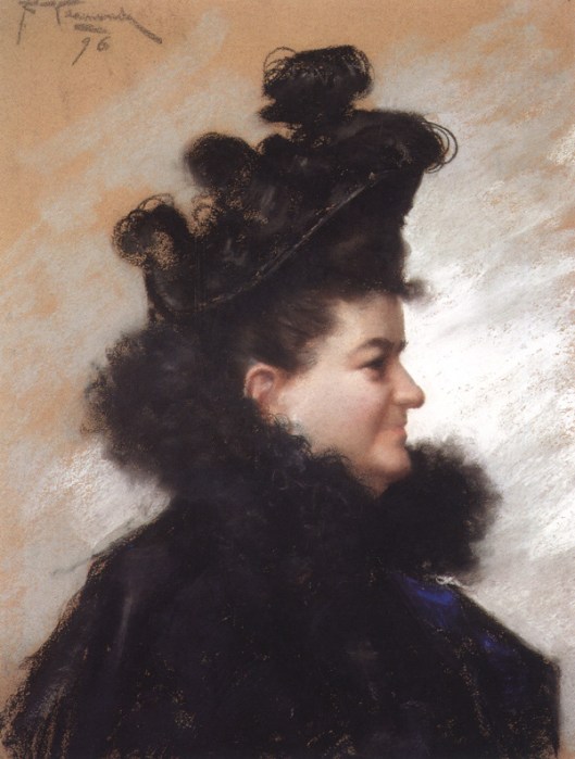 O la pasión dramática reflejada en el rostro de la reina y regente María Cristina de Habsburgo Lorena, aquella princesa austriaca a la que casaron con un petardo fornicador: Alfonso XII*. Al que soportó sus constantes infidelidades y abandonos hasta su muerte, seis años de adulterios continuados de 1879 hasta el fallecimiento de Alfonsito, en 1885. Madre que fue de otro tarambana, Alfonso XIII. Los estudios que sobre la reina María Cristina realiza Raimundo de Madrazo muestran bien ese abatimiento personal, esa angustia de vivir en un país desconocido, reinando en una sociedad ajena a la suya, con unas formas de gobierno para las que no estaba educada la princesita austriaca. Drama, preocupación, tal vez una llamada de auxilio es lo que su rostro reclama al espectador que contempla los retratos de Raimundo.