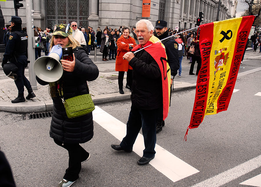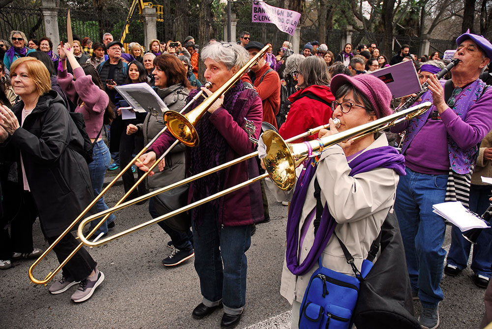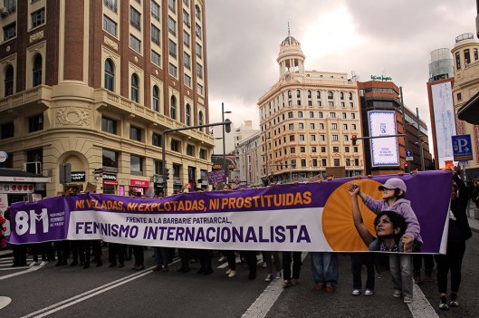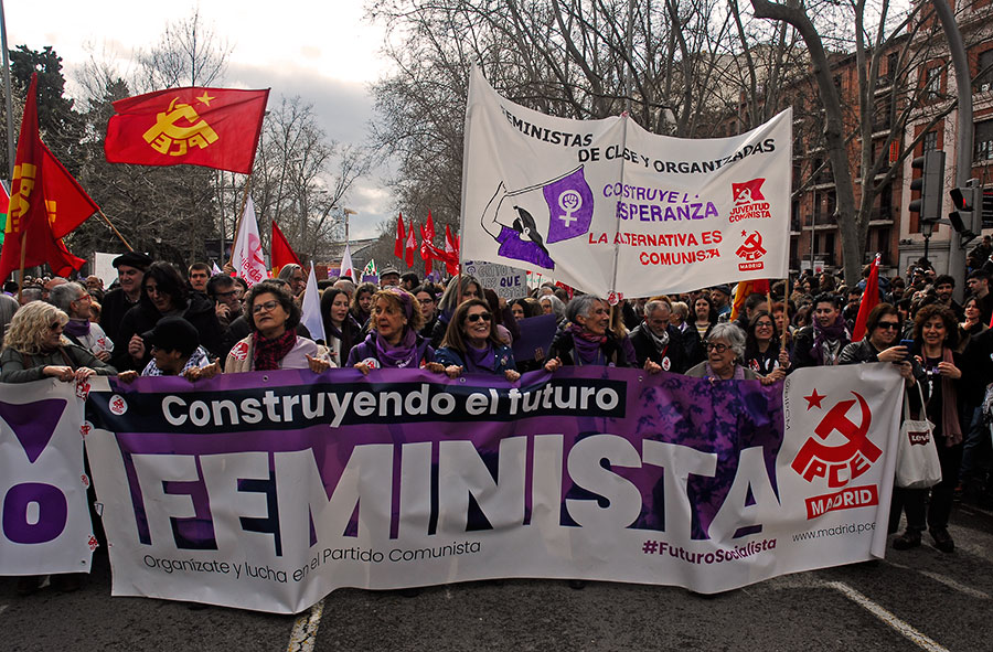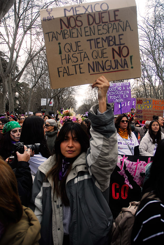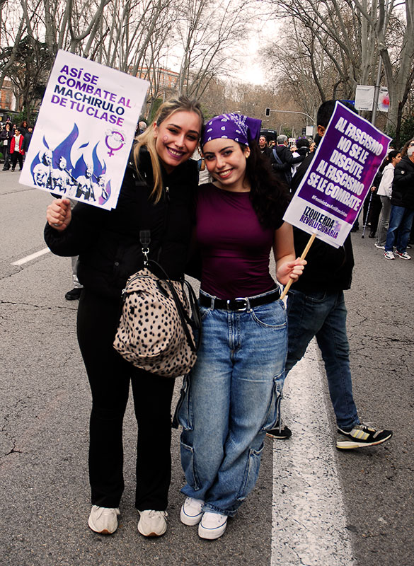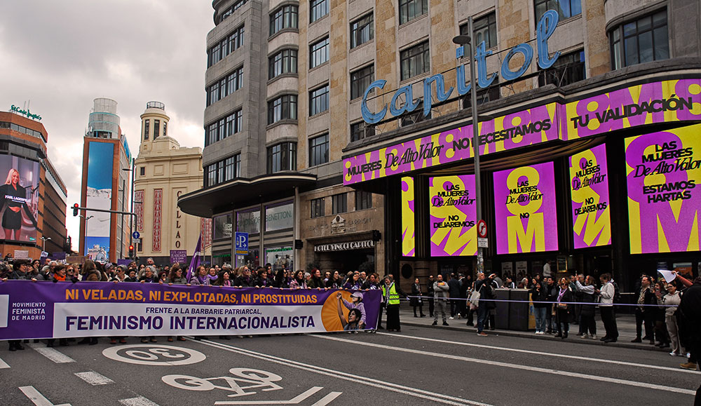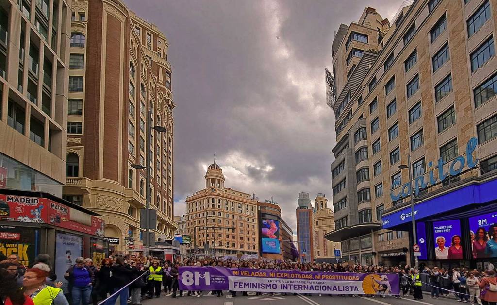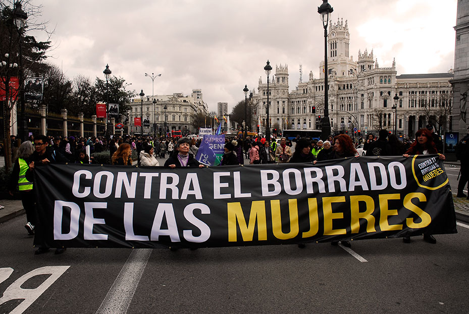 Manifestación a su paso por Gran Vía.Un pequeño grupo de apenas veinte personas, denominado «Plataforma de Mujeres por la Justicia Igualitaria» recorrió en paralelo parte de las manifestaciones enfrentándose a las manifestaciones de la mujer. Manifestantes en el Paseo del Prado.La violencia contra la mujer es un fenómeno internacional.Música en el Paseo del Prado.Manifestante en el Paseo del Prado.Manifestación a su paso por el Paseo del Prado.Cabeza del grupo de manifestantes reivindicando al PCE.