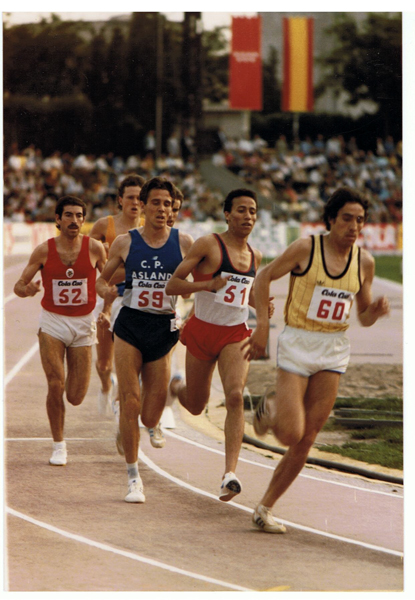 Leitao (52), José Luis González (59) y Said Aouita (51), Estadio Vallehermoso,1985. Said Aouita supuso un verdadero sobresalto en el 5000. Dominó durante un quinquenio desde el 800 al 5000. Campeón Olímpico en Los Ángeles, 1984, en 5000 y campeón del mundo en Roma, 1987.