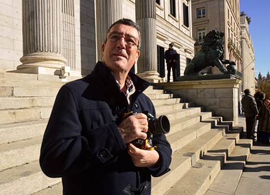 Manuel Pérez Barriopedro, en la puerta del Congreso con su Nikon F3, en enero de 2015.