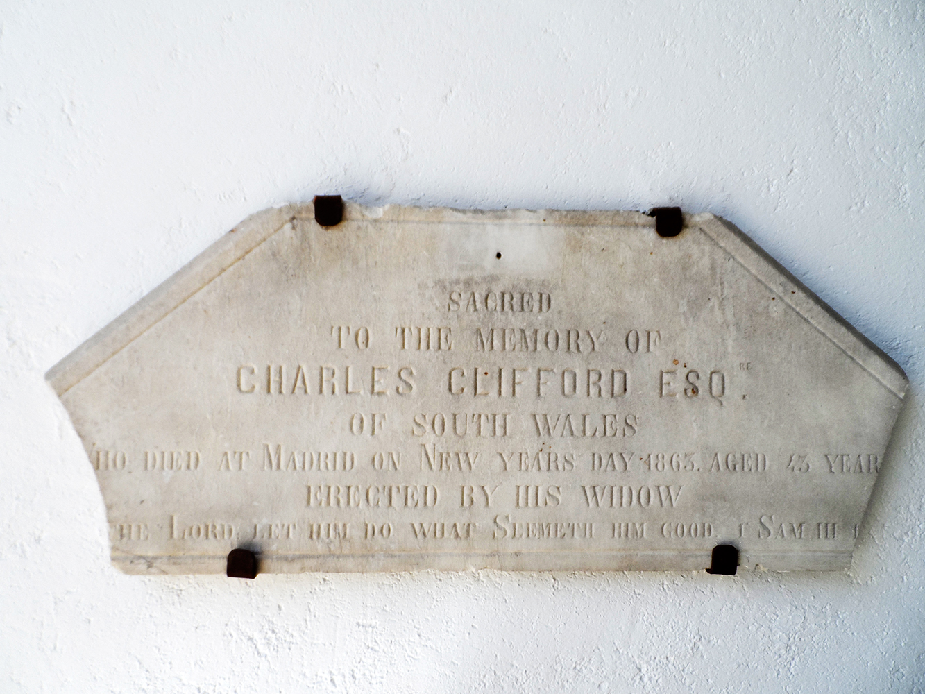 Placa dedicada a Charles Clifford en el Cementerio Inglés de Carabanchel Bajo, en Madrid. Falleció a los 43 años, en 1863. Fue Clifford el primer fotógrafo de obras públicas y paisaje que se recuerda en España. Su entrada libre a edificios públicos y el acceso a personas y lugares hacen suponer que espió en beneficio de Inglaterra. No se sabe dónde está su tumba ni se ha encontrado su certificado de defunción, lo que ha disparado las especulaciones sobre su verdadera misión en la corte de Isabel II.