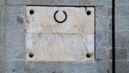 La Batalla de Brunete está considerada como la más sangrienta y cruel de la Guerra Civil. El desenlace puede considerarse de empate técnico. 40.000 vidas humanas se perdieron sin que hubiera decisivos avances en ninguna de las posiciones. El frente ya no se movería hasta el final de la contienda. Tras la misma, Franco se atribuyó la victoria para sí y se dio un homenaje en la plaza de Brunete ignorando a propios y extraños. Colocó dos placas conmemorativas que han resistido al paso de los tiempos y a las leyes de memoria histórica.