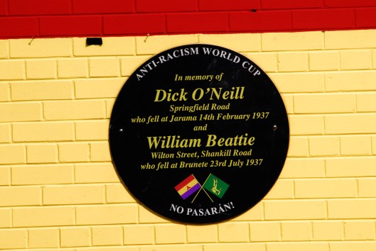 Las Brigadas Internacionales que luchaban por la República tuvieron un elevadísimo número de pérdidas humanas en la Batalla de Brunete. Algunas unidades, como el Batallón Lincoln, quedaron reducidas a una quinta parte. Placa homenaje a dos brigadistas norirlandeses que se encuentra en Belfast, Irlanda del Norte, Northumberland Street, del lado católico. William Beattie falleció en Brunete el 23 de julio de 1937, según se indica en la placa. Dick O’Neil falleció en la Batalla del Jarama el 14 de febrero de 1937.