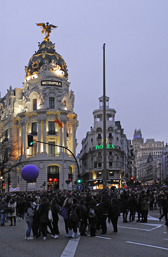 El edificio Metrópolis, de Jules y Raymond Février, aunque técnicamente se encuentra en la calle Alcalá. El edificio conocido como Grassy (1916-1917), de Eladio Laredo y Carranza. Y al fondo Telefónica. En el vértice se apostaba Antonio López para pintar sus célebres cuadros.