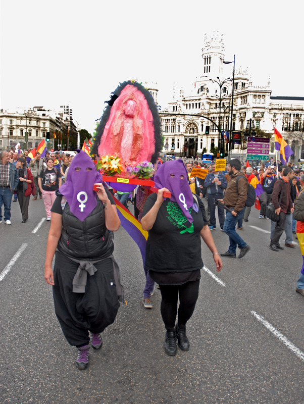 La cofradía del Santo Coño de Calcuta pasea su imagen por la C/Alcalá, camino de Sol, 14 de abril de 2015. Una asociación cristiana la denunció por herir sus sentimientos, nunca habían visto un coño, es comprensible, lo pasaron mal. No se sabe en qué quedó la causa. Los de la asociación siguen sin saber qué es un coño.