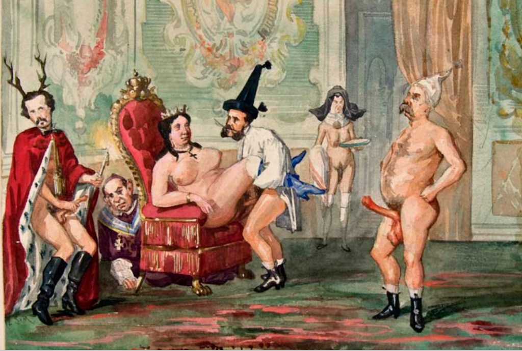 Burlándose del reinado de Isabel II son célebres las caricaturas pornográficas que inspiraron los supuestos sofocos sexuales de la reina. Aunque firmadas por un enigmático SEM, son atribuidas a los hermanos Bécquer, Valeriano y Gustavo Adolfo. En esta aparecen grotescamente los personajes que deambulaban por Palacio: Francisco de Asís, el rey consorte, el padre Claret, la reina, embestida por el general Narváez, sor Patrocinio de las Llagas y el general Serrano.