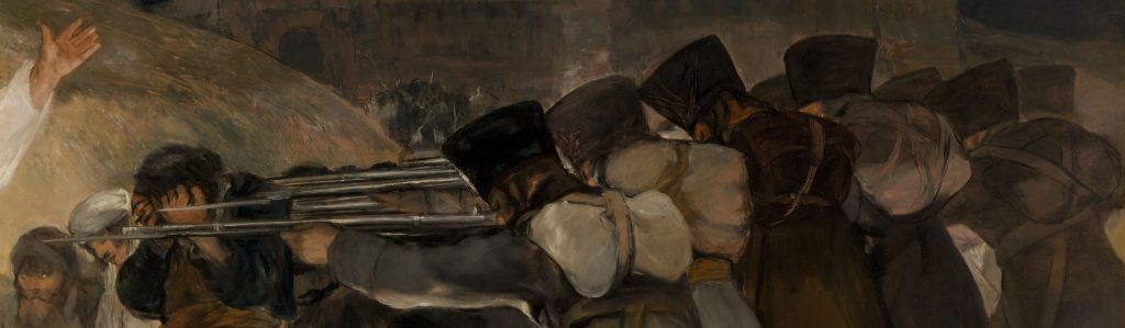 La multitud es un río, cuyo nivel no puede subir cuando recibe el caudal de otro río, y tiene que acomodarse juntando carne con carne y hueso con hueso, hasta que desaparece la personalidad humana en el informe conjunto. Esto pasó cuando los franceses penetraron en la estrecha plaza, y una tempestad de silbidos, reconvenciones e insultos fue la primera manifestación del pueblo español contra los invasores. Entre tanto el desconcierto crecía, la sofocación iba en aumento.Percibía vagamente figuras y formas de esas que no pertenecen al mundo visible, ni a la humanidad, ni a la fama ni a la flora, ni al cielo ni a la tierra, sino a cierta misteriosa geología, a yacimientos que contradicen todas las leyes de la estática y la dinámica; percibía una fantástica y continuada concatenación de colores geométricos que se enredaban en mi cuerpo como culebras y en aquellas trasmutación de lo físico y lo moral, se verifica el fenómeno de que un color me dolía y un objeto semejante a una espada, a un cangrejo o a una arpa pronunciaba palabras incomprensibles.…¡Y los chicos más desarrapados se aventuraban entre los pies de las cabalgaduras para golpearle, y las mujeres le arrojaban el fango de las calles, menos repugnante que las exclamaciones de los hombres, y estos no disparaban sus escopetas por temor de herir a los soldados!Veíanse muchos hombres envueltos en mantas, con sombreros manchegos y abarcas de cuero, otros tantos cuyas cabezas negras y redondas adornaba un pingajo enrollado, última gradación de turbante oriental; otros muchos calzados con la silenciosa alpargata, es pie de gato que tan bien cuadra al ladrón; muchos con chalecos botonados de moneditas, se ceñían la faja morada, que parece el último girón de la bandera de las comunidades…