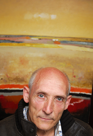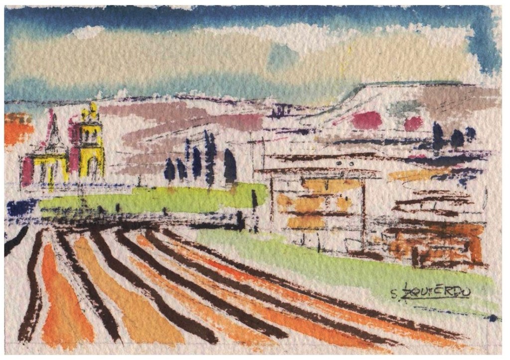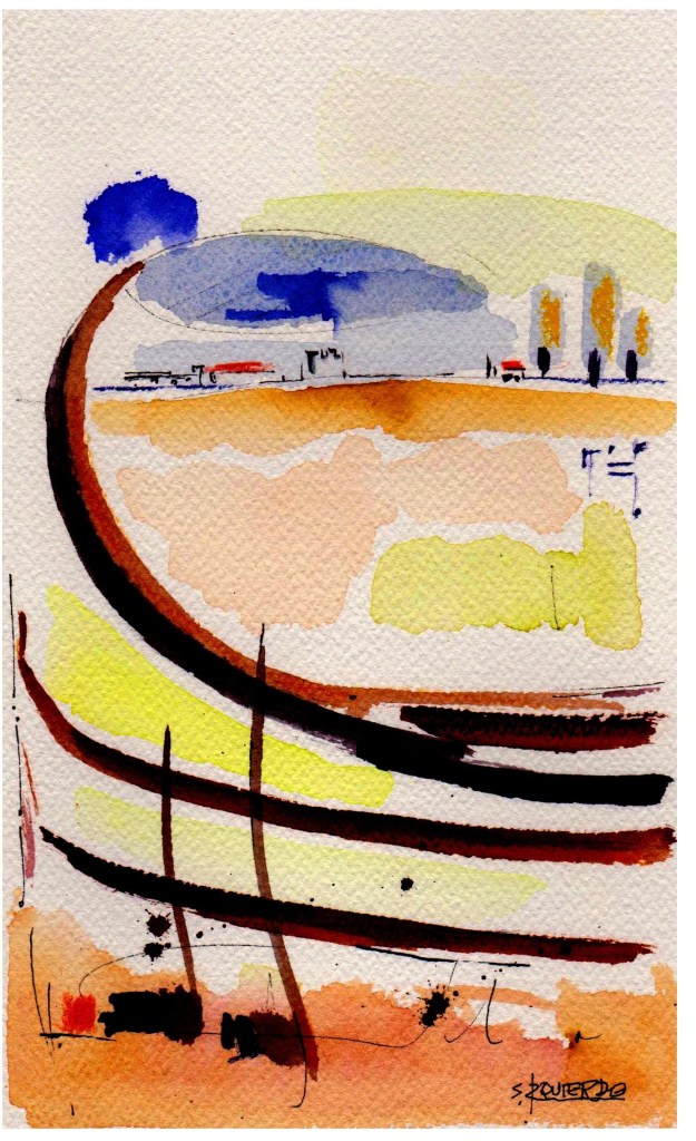 SANTIAGO IZQUIERDO se detiene en el zaguán de un claustro, o de una alameda de sombras crepusculares y con sus pinceles retrata el aire, las viñas, los campos de trigo o de vides rebosantes de frutos y de colores. Después cabalga en su bicicleta de acero de dos arrobas y pedalea hasta el atardecer para llenar sus cuadernos de luces y de pigmentos mientras lee a Machado o a Rubén Darío.