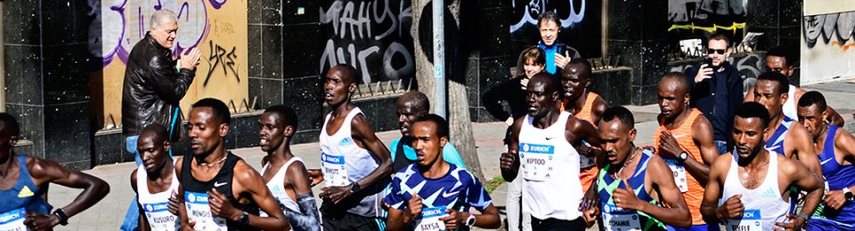La clase obrera va al purgatorio. Purga sus pecados cotidianos corriendo sobre el duro pavés durante 42,195 Km para alcanzar la gloria, la satisfacción del deber cumplido, la alegría de haberse impuesto a una penitencia agobiante, a una tortura asfixiante que le dé sentido a la rutina vital en la que la mayoría de los ciudadanos inundan su existencia. Meses y años de metódico entrenamiento para demostrarse que el reto victorioso de correr una distancia extrema otorga al atleta urbano el control sobre sí mismo. Ese triunfo de la voluntad, de la disciplina de los cuerpos ante la adversidad, ante el dolor físico, ante el agobio diario de pelearse con la vida, de imponerse un recogimiento cartujo, una santidad monacal en busca de la divinidad atlética. El asceta urbano se transforma en Filipides, en portador de la buena nueva de la victoria, recorre el tránsito interior necesario para demostrarse fuerte, inasequible al desaliento, portador de la llama que foguee sus penumbras acechantes, que ilumine los dinteles torcidos y oscuros de la mente. Traspasan, vencedores de sus cuerpos, la meta de lo imposible, han derrotado con su fuerza al enemigo de la duda. De Atenas a Esparta, de la mediocridad diaria a la plenitud de la alegría del éxito sobre nosotros. La meta era esa, acabar la carrera: ¡La Felicidad de patear a nuestros fantasmas, al asfalto!