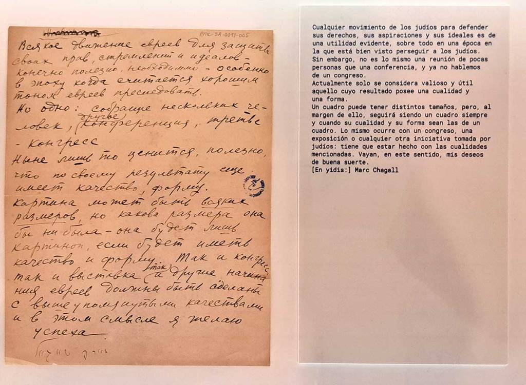 En la exposición “Chagall. Un grito de libertad” se recogen los temas pictóricos y compromisos ideológicos y políticos que ocuparon la mente del artista. Masas policromadas de figuras infantiles, casi naífs, ingenuas, inocentes dibujos de animalitos y composiciones oníricas, cristos crucificados en braguitas, muchedumbres encolerizadas que pueblan sus cuadros como espectadores satisfechos del ajusticiamiento del Redentor que gritaran ¡soltad a Satanás!, rabinos mortificados hasta el sufrimiento con la cruz de su torá a cuestas, cartas manuscritas de las dudas metafísicas que asaltan su mente de judío errante, su implicación con el alma judía, versos anunciando su espíritu de poeta, bocetos ambiguos de sus dioses humanos y divinos como si quisiera expulsar de su alma el conflicto de disfrutar del ideario y de la libertad de occidente heredando la idiosincrasia rusa y la cultura yiddish…