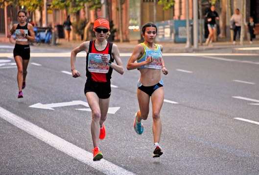 Las chicas vuelan sin tocar el suelo. Claudia Gómez Menéndez, en el centro de la imagen, entre las tres atletas, ha sido la ganadora, con un tiempo de 22′ 29″ en los 6,1 Km del recorrido. A un ritmo inferior a 3′ 15″ el Km. A su lado Silvia Rey Vega, que terminaría tercera. Y detrás Yvana Zagorac, que terminaría segunda.