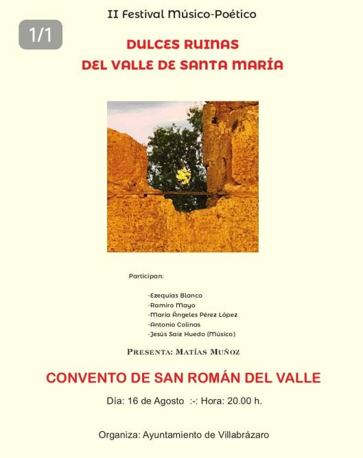 Sonetos, teoremas, música, historia, paisaje, estrellas fugaces labrando de resplandores efímeros las noches de Castilla. Ezequías Blanco, letrado en álgebras y matemático en alejandrinos, organiza junto con el Ayuntamiento de Villabrázaro, Zamora, y acompañado de un grupo de amantes de las rimas consonantes y de los arpegios en A mayor el II Festival Músico-Poético DULCES RUINAS DEL VALLE DE SANTA MARÍA.