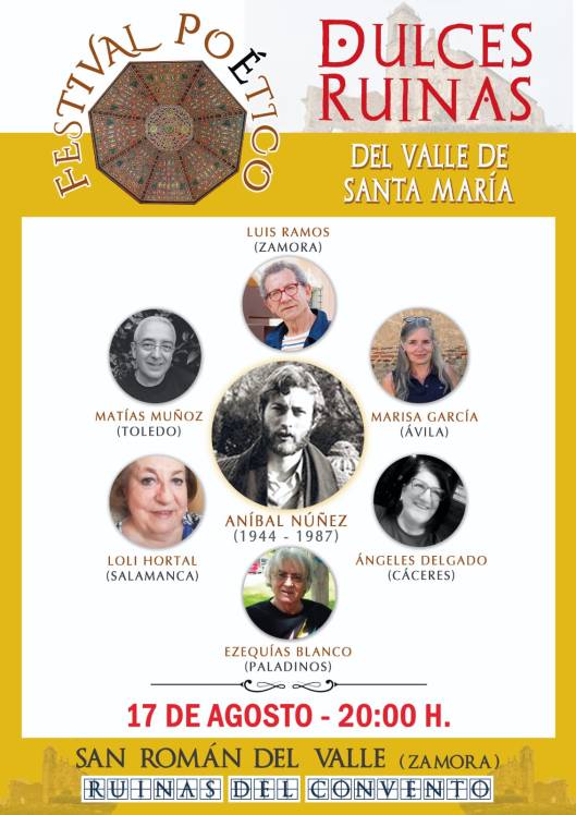 Todos ellos se verán las caras, rendirán un homenaje al Poeta Aníbal Núñez, tristemente desaparecido, y leerán sus versos en el Festival Músico-Poético “Dulces Ruinas del Valle de Santa María”, que se celebrará en San Román del Valle, el próximo 17 de agosto, a las 20:00 h. Organiza Ayuntamiento de Villabrázaro, todo ello en Zamora. La esencia de la santa de Ávila (Bernini no ha confirmado aún su asistencia) impregnará el festival, aunque no lea poemas.