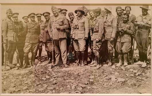 Desembarco de Alhucemas, 8 de octubre de 1925. Primo de Rivera (el grandote, fumando, con gorra legionaria y bastón de mando, dictador tras el golpe de estado que pronunció el 13 de septiembre de 1923. Su majestad Alfonso XIII diría de él al rey italiano Víctor Emanuel III: «Este es mi Mussolini») se da un homenaje junto a los militares africanistas. A la izquierda aparece el entonces coronel Franquito, subido a una piedra para disimular su escasa estatura personal. (Foto que forma parte de la exposición «Unamuno y la política. De la pluma a la palabra«, que se expone en la Biblioteca Nacional.)