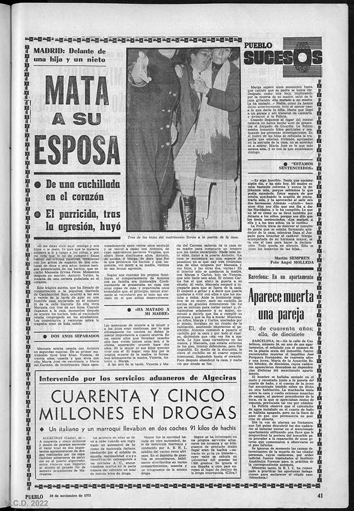 Su Excelencia continúa sus vacaciones. Página 7 del diario PUEBLO, de 10 de abril de 1974. Página 9 del diario PUEBLO, de fecha 28 de agosto de 1975 donde se informa del comienzo del Consejo de Guerra a los etarras Garmendía y Otaegui. Garmendía fue fusilado el 27 de septiembre de ese año en Burgos.Página 41 del diario PUEBLO, de 30 de noviembre de 1971. Lamentablemente en aquella época también eran frecuentes los parricidios.