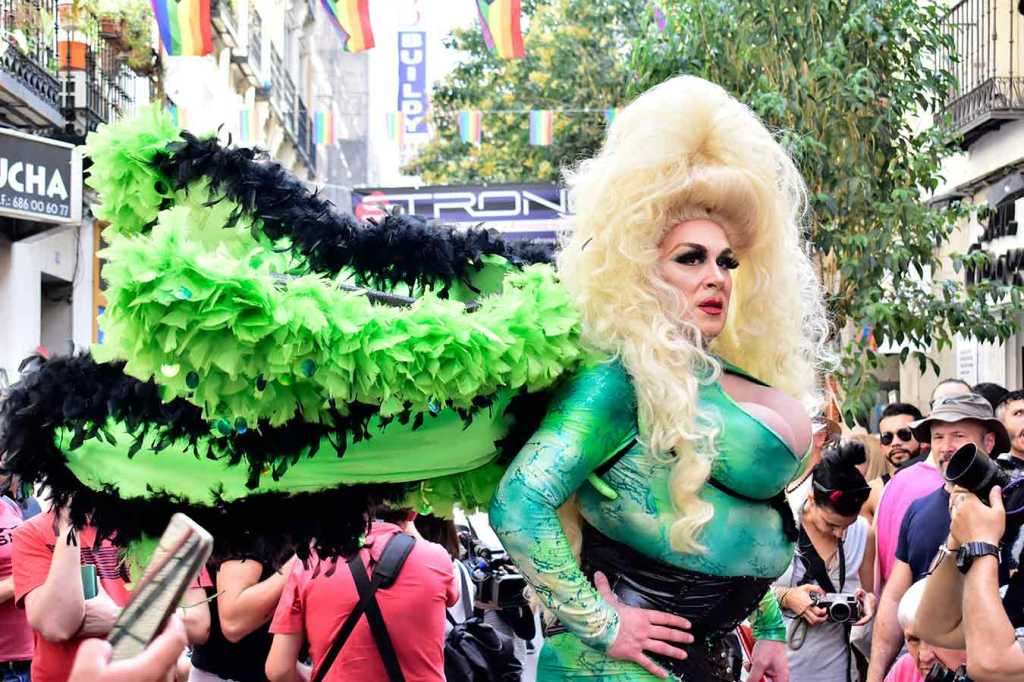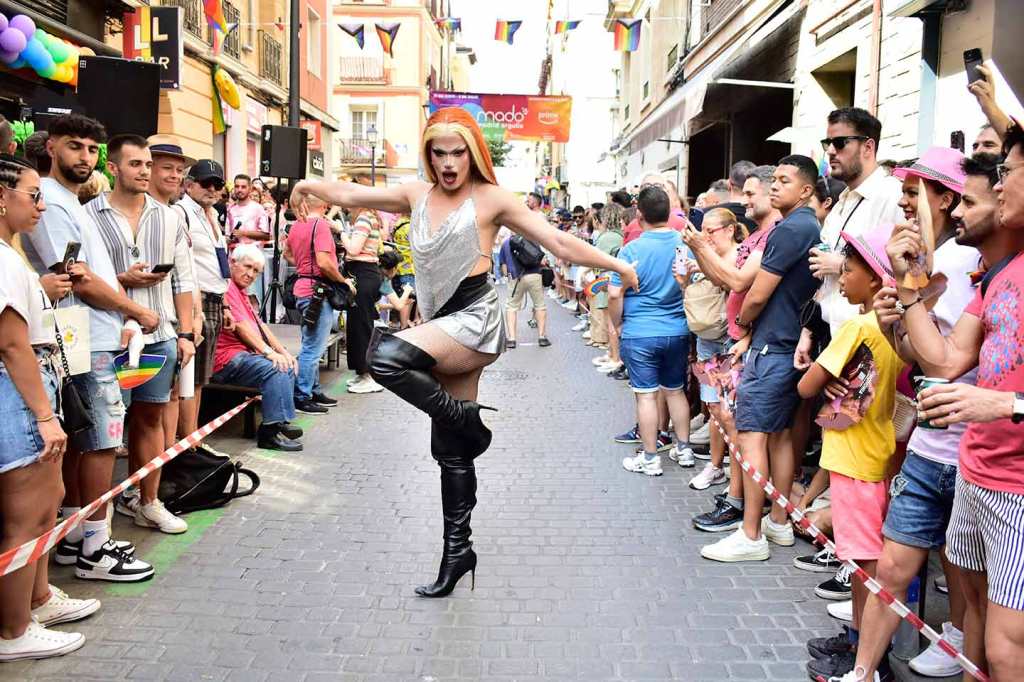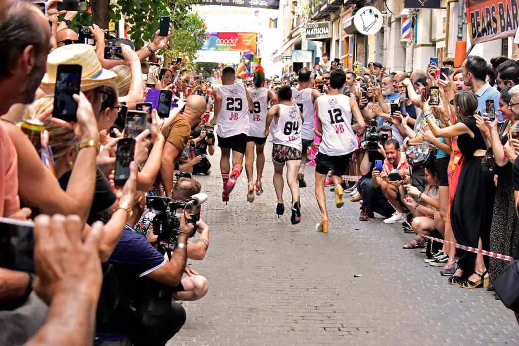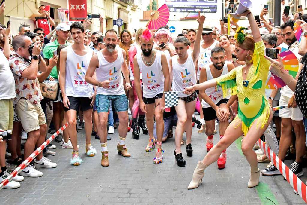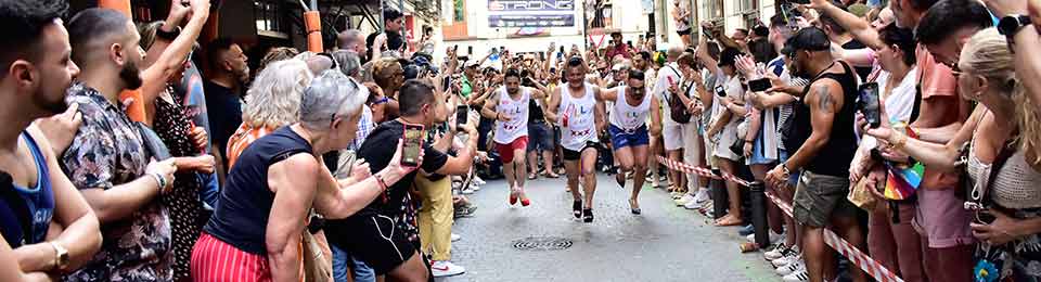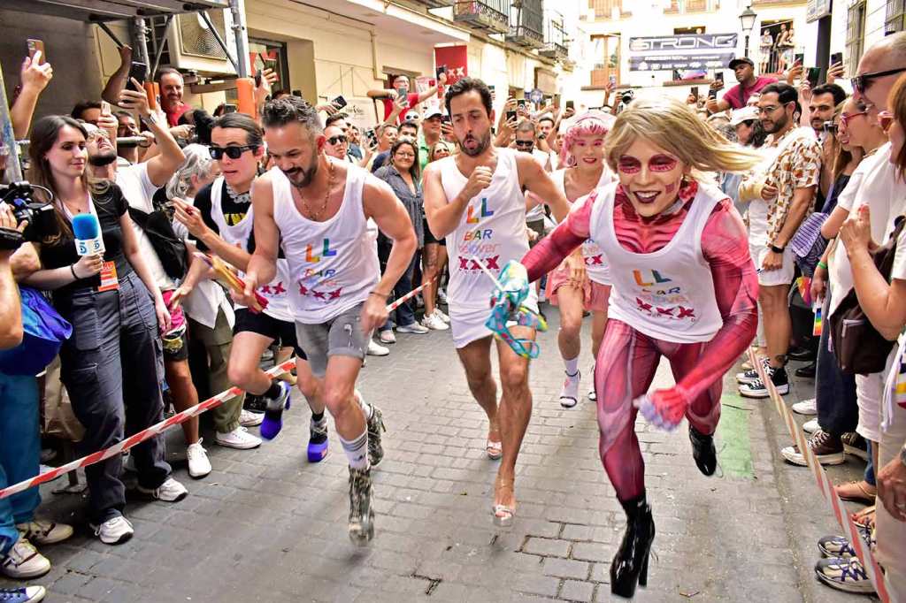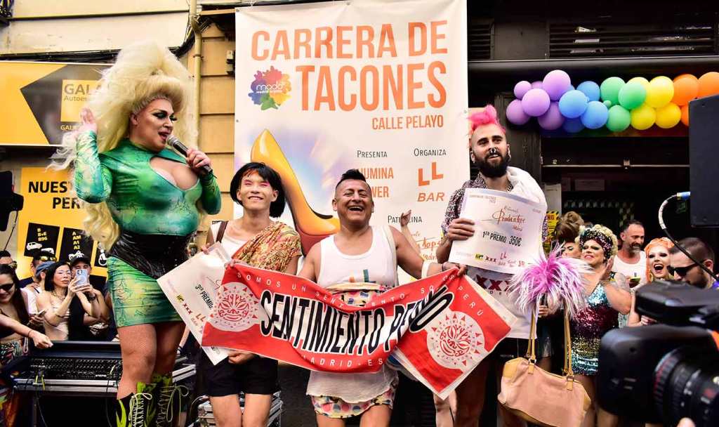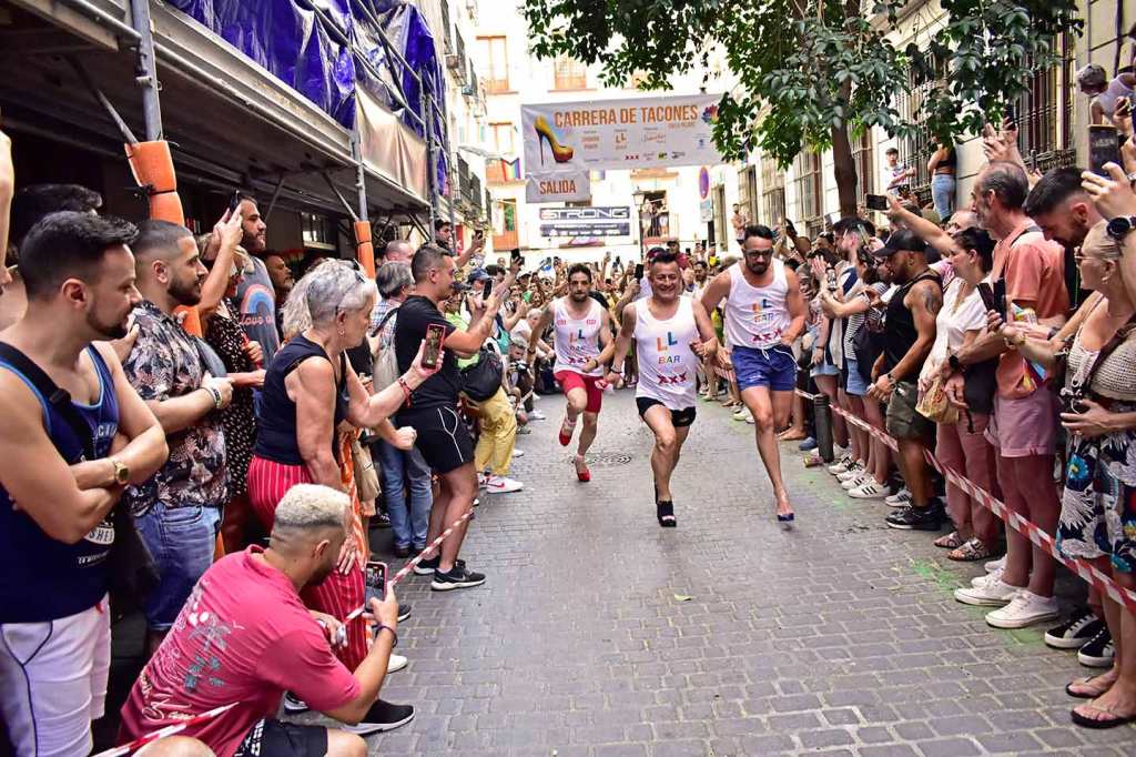Doscientos cincuenta metros tiene la calle Pelayo, al lado de la Gran Vía, lo más chic de Madrid. No cabe un alfiler la tarde del jueves 29 de junio a pesar de que hay 36º y que las pieles exultantes de felicidad irradien calor de axila y entrepierna inflamada. ¿Cuántos cuerpos, dos mil, tres mil, tal vez cinco mil en tan reducido espacio? Chumina Power Forever incendia de risas a la multitud con sus chistes marranos de pollas del 20 y agujeros truculentos, suena la Carrá por megafonía: ¡para hacer bien el amor hay que venir al sur, sin amante ¿quién se puede consolar?, sin amante esta vida es infernal!, sudor, roces constantes, humedades, secreciones y sofocos calenturientos cuando le insinúan una cita. «Señor, señor, quién me iba a decir a mí que me vería en este antro», se pregunta Martínez el facha aceptando con la mirada la mirada del boy. Él, que votó hace a un mes a los ultras y aplaudió lo de quitar la bandera del ayuntamiento. «Y ahora verme aquí, a escondidas, sin decir nada a los míos de dónde iba esta tarde, ¡si se entera Margarita!, mi señora, algo sabe, que ella no es tonta, aunque nunca lo hayamos hablado, el caso es que el rubio está como un tren y yo… bueno yo siempre he admirado en secreto esos cuerpos tallados en el gimnasio… ¡Que me gustan los tíos, vamos, si lo sabré yo!» Erguidos en sus andamios de puntera kilométrica los corredores se alinean en la salida como si fuera el Gran Prix de Mónaco, televisiones de todo el mundo grabando el momento: chinas, japonesas, Reuters, AFP, EFE, RTVE, Telemadrid, la Otra, la telebasura del espagueti, decenas de fotógrafos, que aquello parece la final de la Champions. Banderazo de salida. Y en olor, o hedor, de multitud los atletas taconean despavoridos entre los alaridos de los miles de gargantas como si fuera la cima del Alpe d’Huez y desde la barrera todos berrean gritos de ánimo y los llevan en volandas calle Pelayo arriba, calle Pelayo abajo, que ni Usain Bolt correría mejor entre tanto calor humano, casi caldera de epidermis y andrógenos desatados. Y Chumina se inflama y Chumina se arrebata y Chumina berrea sus chistes guarros al paso de los esforzados por la meta y premia con el laurel a los vencedores. Muy internacional el podio. Uno es de Taiwan, “como mis tetas”, asegura Chumina. Y otro del Perú, “que siempre repites, hijo puta, que te veo entrenar todos los días por la calle a las seis de la mañana”. Y uno de Toledo, “que sé yo que te gustan los peluqueros, que por eso llevo yo este pelucón rubio”, y le hace un guiño con sus pestañas de rímel. Y todos bailan y todos sudan y bajo el podio la concentración humana es tan densa que parece que los cuerpos se fundieran en deseos de magreos e intercambio de fluidos. Desde los balcones arrojan agua para refrescar el ambiente, dichosos los mojados, que son muchos, no necesariamente por el líquido elemento.